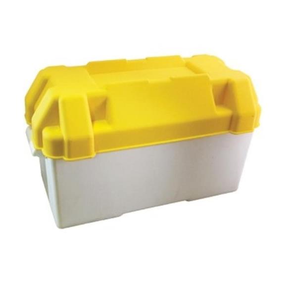 Accubak gemaakt van zuur- en petroleumbestendig kunststof met spatwaterdichte deksel. Wordt geleverd met een riem om af te sluiten en te vervoeren.