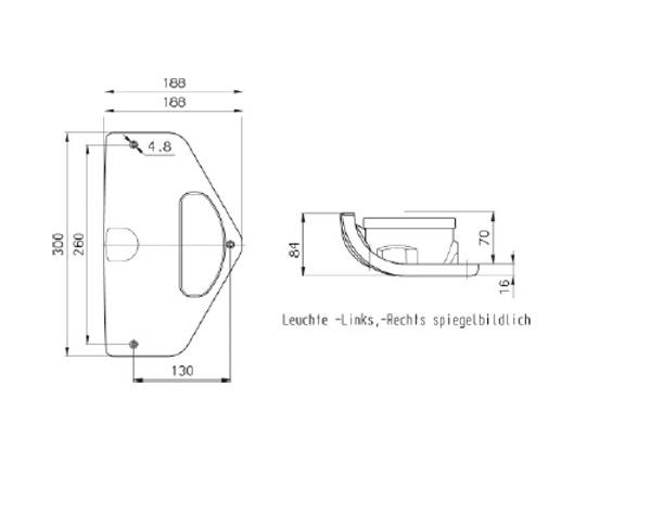 Achterlicht inbouw serie 2000. Loopt rond aan de linkerzijde naar de zijkant van de caravan. Voorzien van vlakke aansluitstekkers.