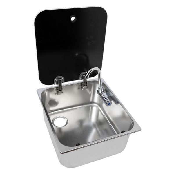 RVS rechthoekige spoelbak met glazen afdekking en koudwaterkraan.