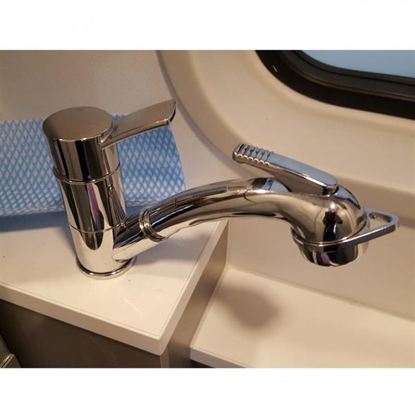 De menkraan Conture E wordt geleverd met de uitloop met douchekop type Charisma. De aansluiting is een UniQuick van 25 cm.